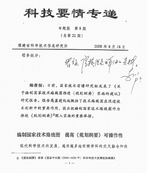 9月2日,李川副省長對省科技信息研究所創(chuàng)辦的《科技要情專遞》專題版第8期刊出的《編制國家技術(shù)路線圖,提高<規(guī)劃綱要>可操作性》一文作出重要批示:“很重要,請?zhí)峁└敿毜馁Y料”。接到批示件后,省科技信息研究所立即組織人員落實李川副省長的批示精神,著手相關(guān)資料的收集與深入分析。