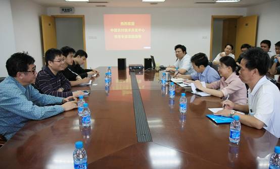 圖:科技部中國農村技術開發中心星火與信息處袁學國博士(左二)和農村黨員干部遠程教育《農村科技》節目總編焦林(左一)一行