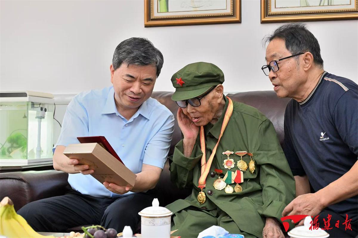 省領導分別來到張輝、李國元、趙宗信、王懷杰、張志一、張玲等抗戰老戰士家中,為他們佩戴紀念章,認真聆聽老戰士講述抗戰故事、回憶崢嶸歲月,感謝老戰士作出的歷史貢獻。省領導說,在各位抗戰英雄身上,充分展現了天下興亡、匹夫有責的愛國情懷,視死如歸、寧死不屈的民族氣節,不畏強暴、血戰到底的英雄氣概,百折不撓、堅韌不拔的必勝信念。黨中央開展一系列活動紀念中國人民抗日戰爭暨世界反法西斯戰爭勝利80周年,再次充分彰顯了以習近平同志為核心的黨中央對抗戰老戰士的高度重視和深切關懷。福建是著名的革命老區、中央蘇區,黨史事件多、紅色資源多、革命先輩多,具有光榮的革命傳統和鮮明的紅色基因。全省廣大黨員、干部群眾要永遠銘記為中華民族和中國人民作出貢獻的英雄們,傳承紅色基因,弘揚偉大抗戰精神,切實崇尚英雄、捍衛英雄、學習英雄、關愛英雄,勠力同心為全省在中國式現代化建設中奮勇爭先而團結奮斗。要廣泛開展愛國主義教育,大力宣傳和弘揚各位老戰士的革命事跡和革命精神,從中接受精神洗禮、堅定理想信念,更好匯聚新時代新福建建設的磅礴力量。